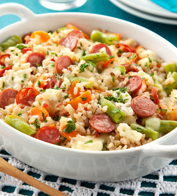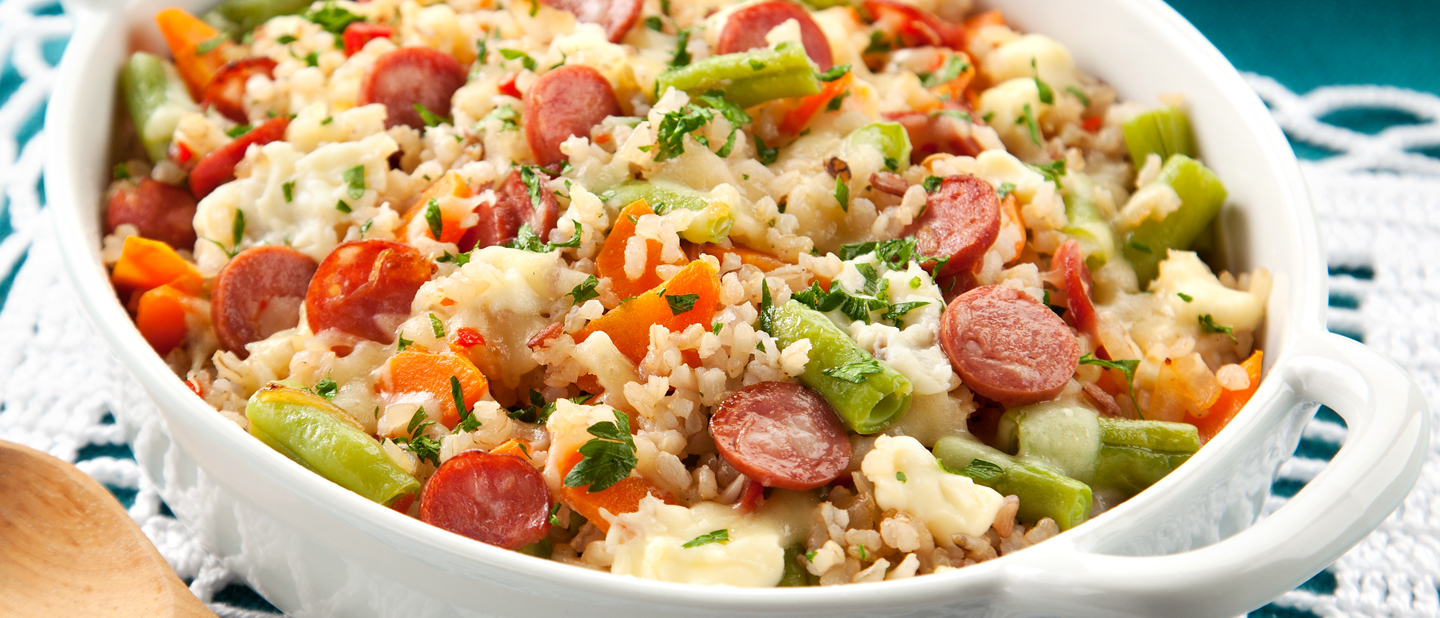 Linguiça: frite no Óleo de Canola Soya a linguiça, o alho, a cebola e o pimentão. Adicione a vagem e a cenoura, misture bem, acrescente o caldo de legumes e deixe cozinhar em fogo médio, com a panela tampada. Se necessário, adicione um pouco de água. Corrija o sal e adicione o requeijão. Desligue o fogo, misture os legumes ao arroz integral e sirva imediatamente. Se preferir, sirva este prato como salada, substituindo a linguicinha por cubinhos de frango grelhados ou presunto picado.