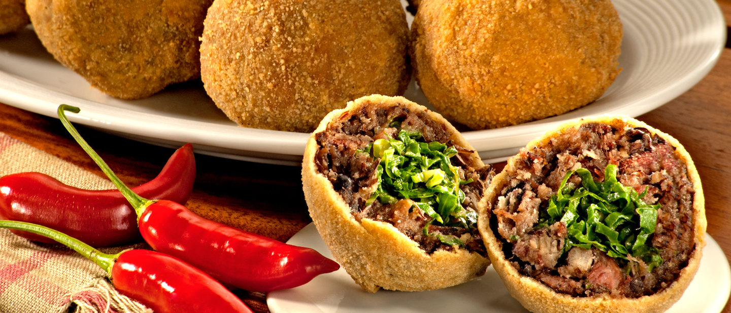 Montagem: forme bolinhas com a mão, e com o dedo indicador abra o centro delas. Recheie com a couve e feche em seguida. Passe-as em farinha de trigo, em seguida nos ovos batidos e, por último, na farinha de rosca. Frite-as em Óleo de Soja Soya quente. Escorra e sirva imediatamente.